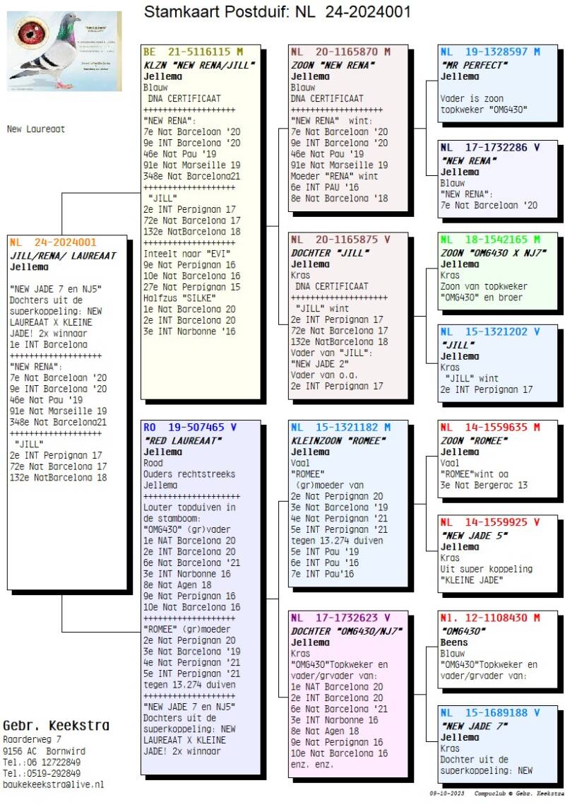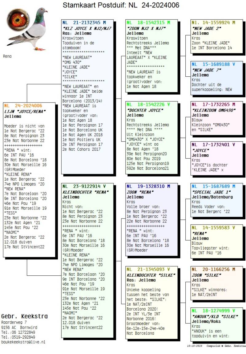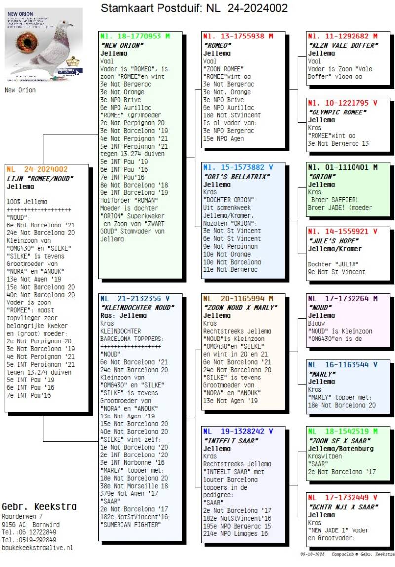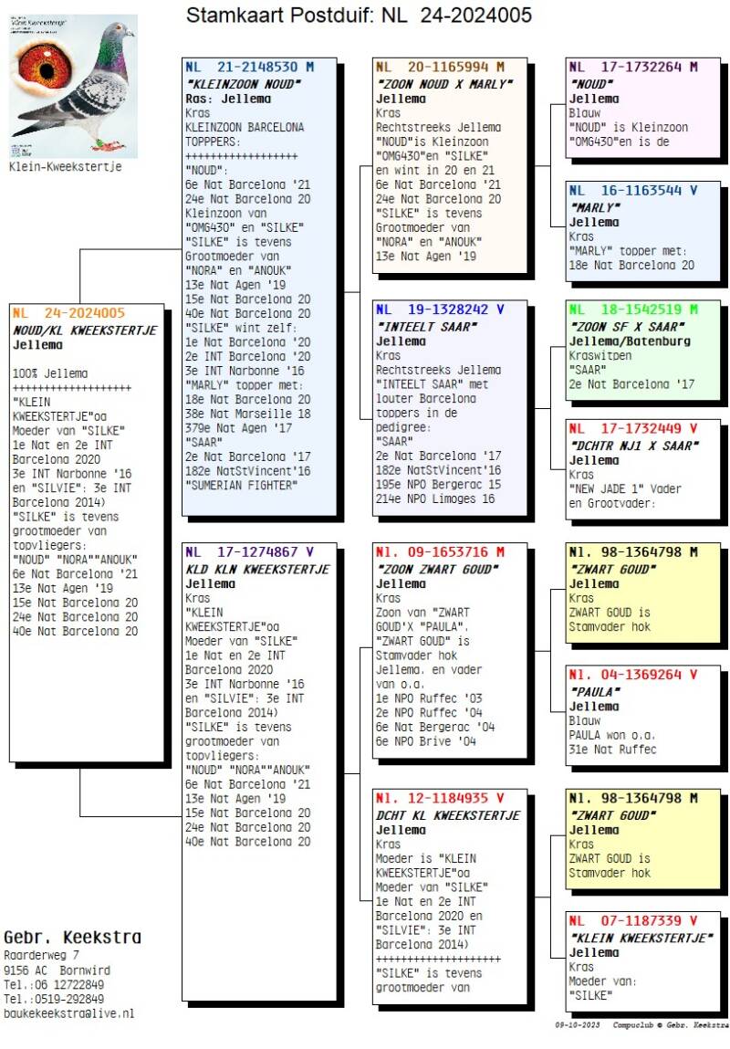Jellema heeft in 2023 weer uitzonderlijk gepresteerd met zijn stam duiven. Daarom zijn er ook nu weer 7 koppels, met de beste genen, zorgvuldig samengesteld. De vaandeldragers van de recente successen zijn volgens ons o.a.: