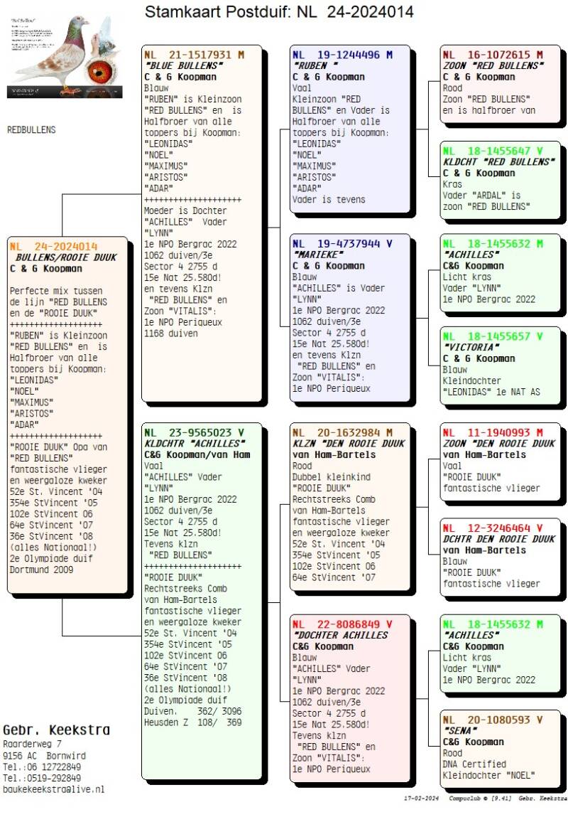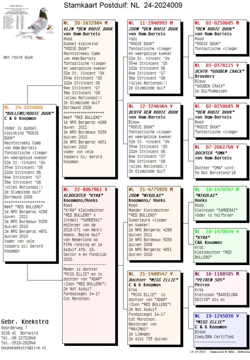 Hieronder dus de samengestelde koppels voor het komende jaar, uiteraard onder voorbehoud van eventuele wijzigingen. Tevens zijn de pro forma stambomen van de jonge duiven 2024 hierbij afgedrukt.