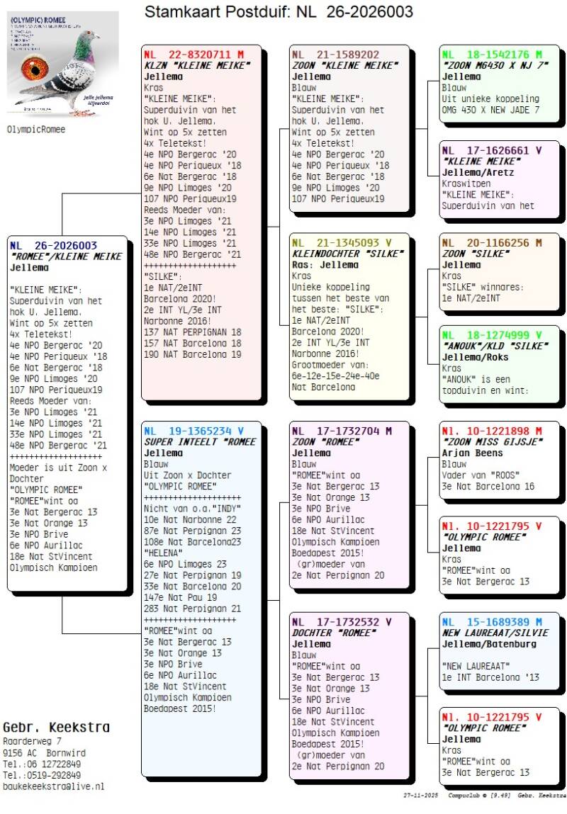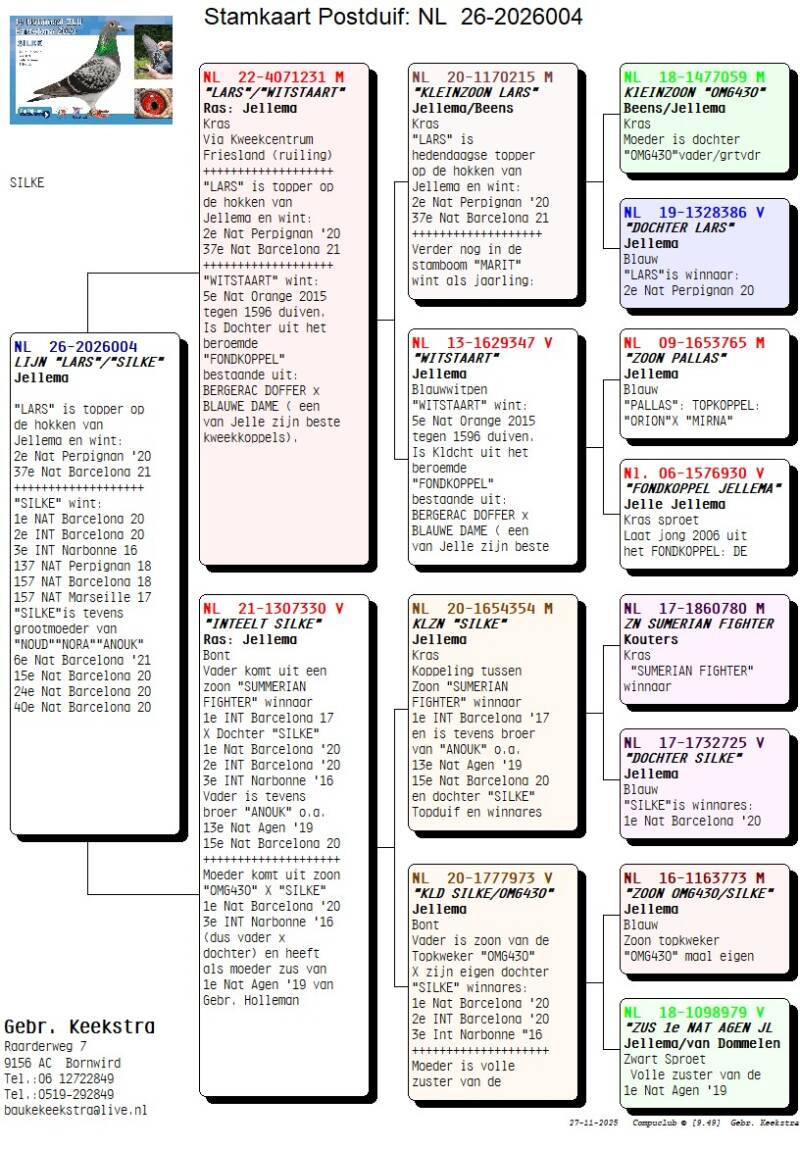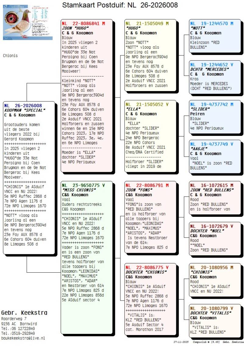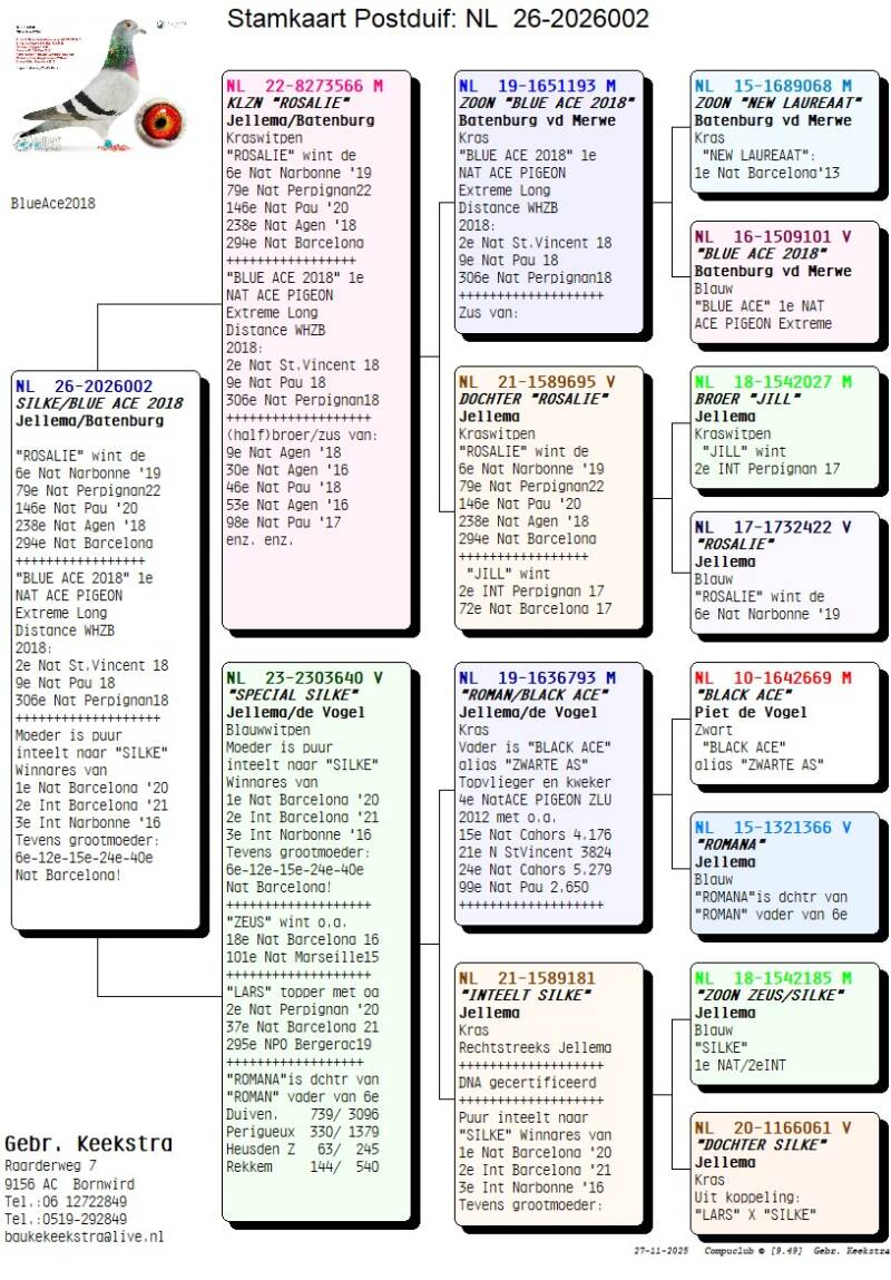 14 koppels zijn met zorg samengesteld uit de beste lijnen van de grootmeesters van het zware labeur: Jellema en C&G Koopman. Ook na de grote exclusieve verkoop op PIPA zit er nog lang geen sleet op de prestaties van het hok Jellema. In 2025 waren de prestaties weer zeer indrukwekkend. Niet alleen bij Jelle maar ook bij vader Ultsje welke zelfs de grote kampioen werd bij de Friese Fond Club op de overnachting. Gerard Koopman, bekend om zijn "RED BULLENS" verkocht begin dit jaar ook zijn top duiven om door te gaan op de Oneloftracing vluchten. Koopman heeft natuurlijk ongelooflijk vele kopprijzen behaald op de overnacht en dat op een van de verste afstanden van Nederland.