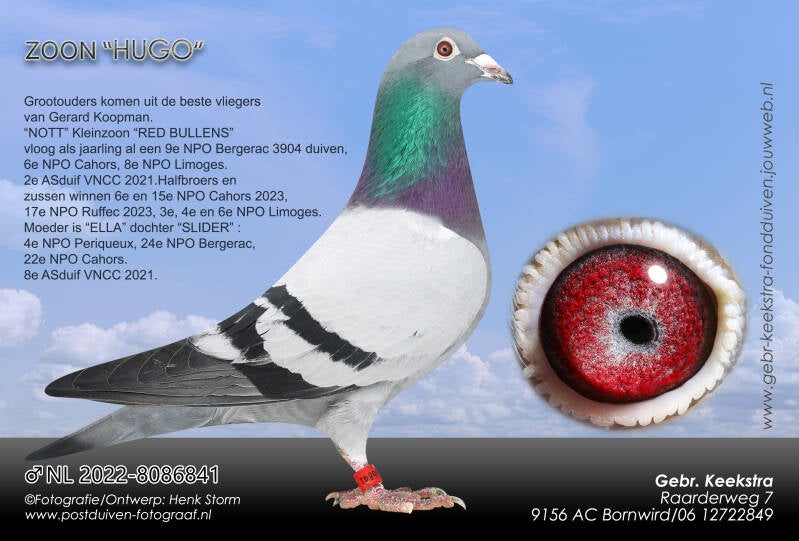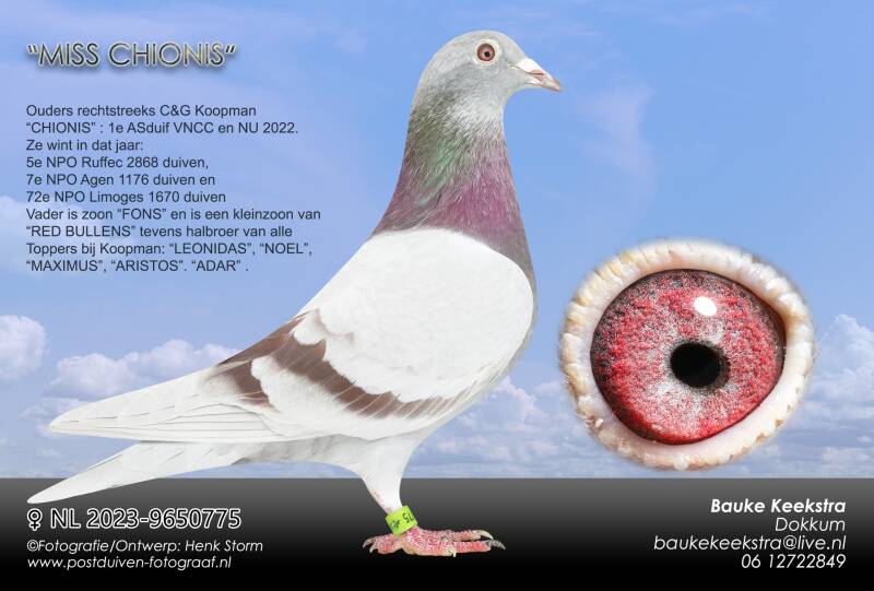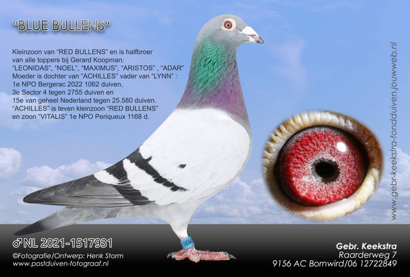 Ook zijn er koppels samengesteld uit het beste van C&G Koopman. De aankoop, destijds bij Jan Bullens, door Gerard van de superieure kweker "RED BULLENS" stroomt door alle toppers bij Gerard Koopman. Vele liefhebbers slagen inmiddels met deze duiven o.a. Kees Mooiweer uit Emmen. Kees heeft al geweldige prestaties behaald met deze soort. Menig TT notering staat al achter zijn naam en hij behaalde met deze duiven in 2023 de titel 3e Nationaal aangewezen kampioen op de Marathon. Ook Henderikus Ruiter is in het bezit van de zuivere Koopman duiven. Hij kocht op de totale verkoop van Gerard Koopman een zoon van "EVARISTOS". Een kleindochter is bij Henderikus aangeschaft en staat bij de onderstaande koppels. Zijn vader had het afgelopen jaar de op een na beste duif op de overnacht in de Afdeling 10 met een zuivere "Koopman" terwijl de eerder genoemde Kees Mooiweer notabene de beste duif op de overnacht Afdeling 10 had!