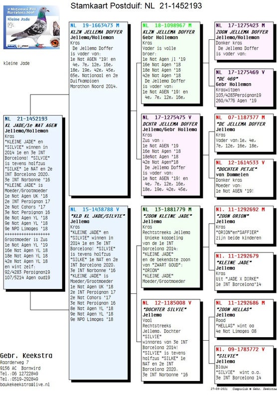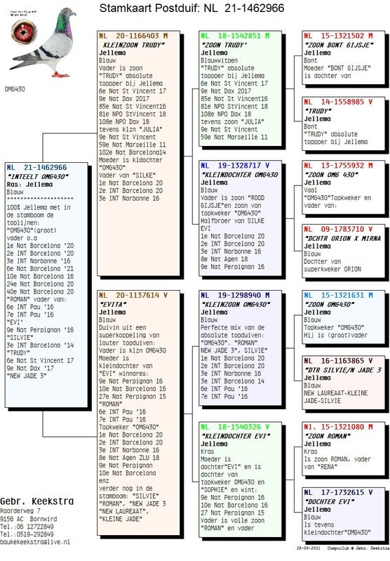 Moeder is kleindochter “OMG430” vader van vele toppers: 1e Nat Barcelona ’20, 2e INT Barcelona ’20, 3e INT Narbonne’16, 8e Nat Agen ’18, 9e Nat Perpignan ’16, 10e Nat Barcelona ’16, 13e Nat Marseille ’16 enz. Vader is kleinzoon “OLYMPIC ROMEE” topvlieger met: 3e Nat Orange ’13, 3e NPO St Vincent ’13, 3e Nat Bergerac ’13, 5e NPO Brive ’14, 6e NPO Aurillac ’12 en tevens Olympiade duif in Boedapest. “Romee” is thans een van de belangrijkste kwekers van Jellema.