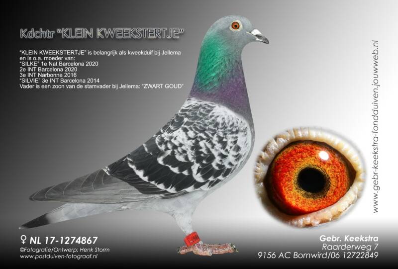 „KLEIN KWEEKSTERTJE“ : Moeder van „SILKE“ 1e Nat Barcelona 20, 2e INT Barcelona 20, 3e INT Narbonne 16 en „SILVIE“ 3e INT Barcelona 14! „SILKE“ is op haar beurt weer Grootmoeder van de topvliegers: „NOUD“, „NORA“, ANOUK“