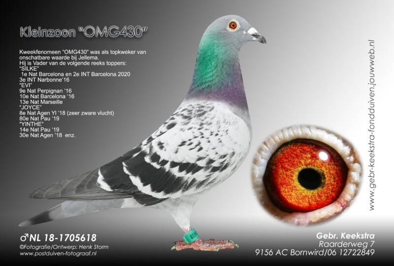 Fenomenale kweker bij Jellema, helaas ontsnapt in 2018. “OMG430” is (groot)vader van topduiven als “SILKE”, “ JOYCE”, “EVI”, “YINTHE”, “NOUD”, “NORA” winnaars van o.a. 1e Nat Barcelona/2e INT, 3e INT Narbonne ’16, 6e Nat Barcelona ’21, 8e Nat Agen ’18, 9e Nat Perpignan ’16, 10e Nat Barcelona ’16, 13e Nat Marseille ’16, 14e Nat Pau ’19 enz.